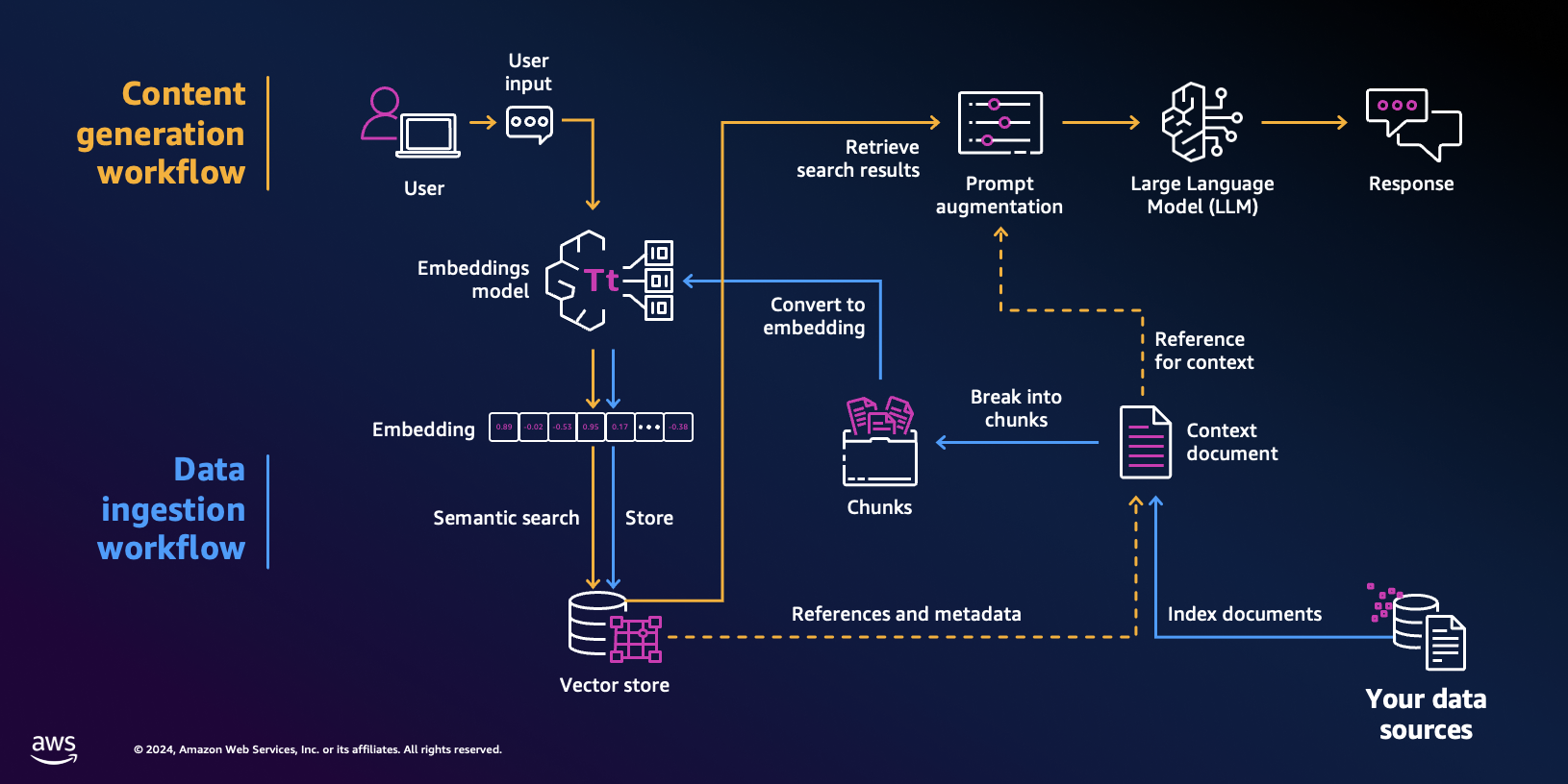Retrieval Augmented Generation (RAG) requires the indexation of relevant unstructured documents into a vector database. Then given a customer query, the relevant are retrieved and past as context to the model, which generates an answer. This can best be described by the following flow.