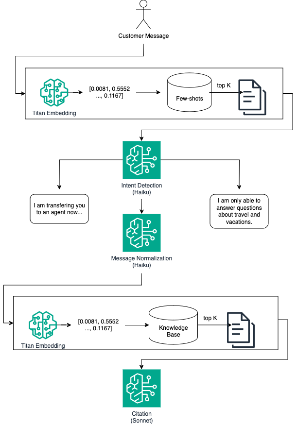 The previous components offer important primitives to build a performant RAG solution. They act as building blocks of a broader solution. We provide an example showcasing how they can be brought together in a single chain to improve response accuracy. To minimize latency and improve accuracy, we use Claude Haiku for simpler tasks and Claude Sonnet where we need more performance. The pipeline is described by the following diagram.