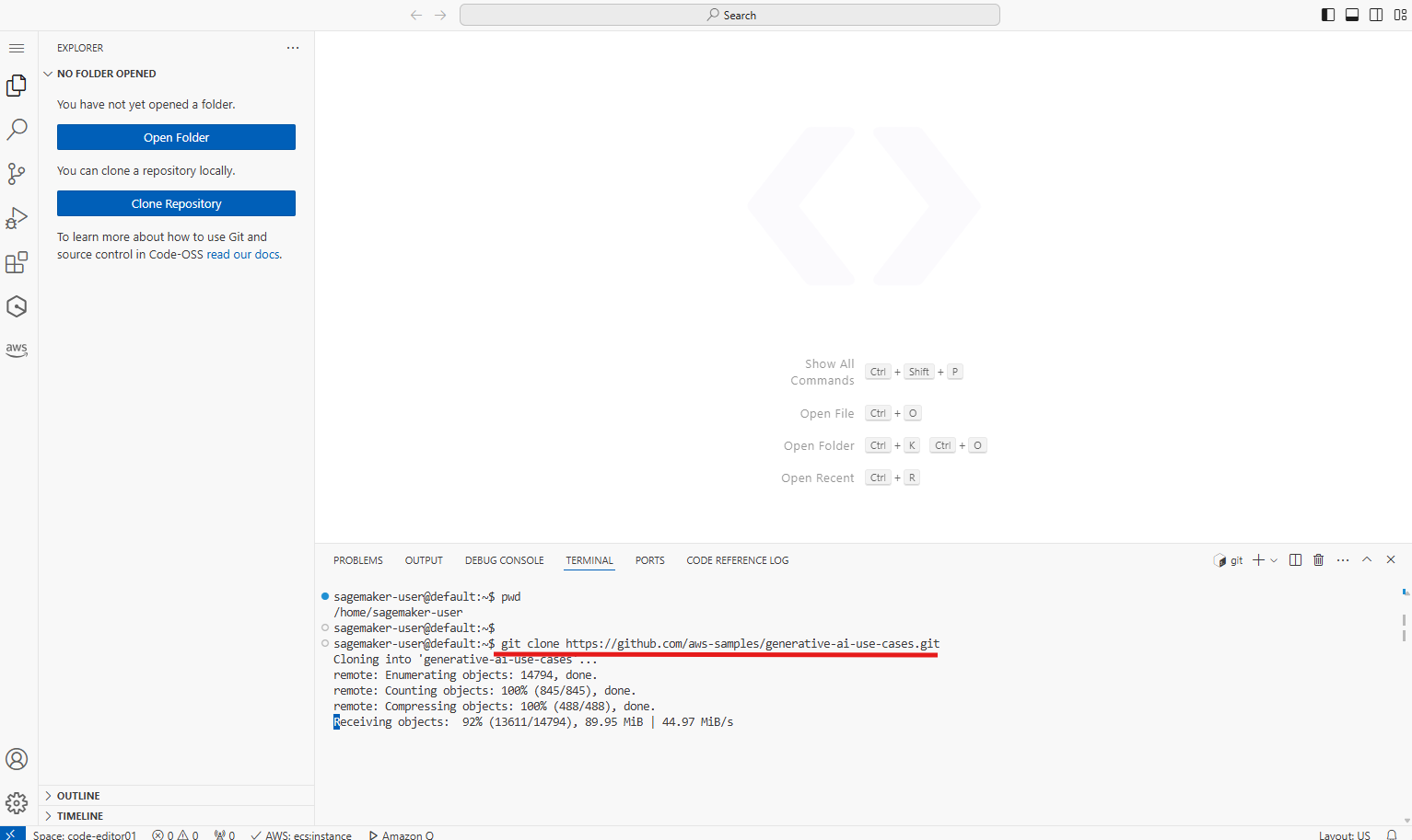 SageMaker Code Editor を開いたあと、Open Folder で GenU のディレクトリを開きます。ターミナルで git clone をしたディレクトリに移動します。